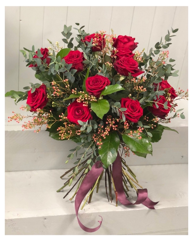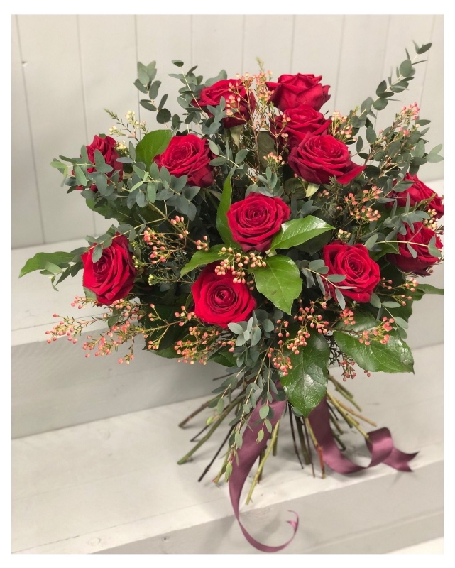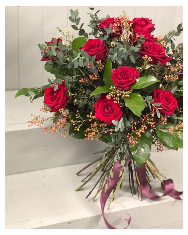 Selecting only the finest long stem red roses we will combine them with seasonal foliage to create this classic bouquet. All bouquets are luxuriously wrapped and come with our own signature branding and ladybird adornment.
